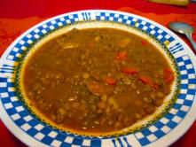 Ingredientes:½ kg. de Lentejas.1 Chorizo.1 Tomate.2 Cebollas.1 Zanahoria.2 dientes de Ajo.175 gr. de Tocino.Pimentón dulce o picante.Aceite de oliva.Pan frito