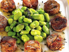 Ingredientes:1 Hígado de Pato fresco400 gr. de Habas frescas2 dientes de Ajo2 cuch. Aceite de Oliva virgen200 ml. Vino de Oporto200 ml. Vino de Jerez1 rama de TomilloSalPimienta