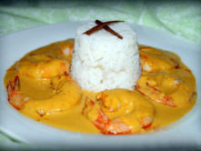 Ingredientes:16 langostinos 1/2 cebolla2 dientes de ajo20 dl. Tomate frito20 dl. Nata para cocinar1 cucharadita de currySalAceite de oliva virgen extraArroz largo1 cucharadita de hierbabuena