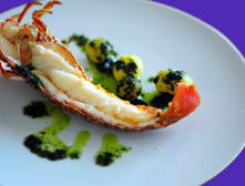 Ingredientes:2 Langostas medianas125 ml Aceite de Oliva10 Almendras1 diente de Ajo25 gr. de Queso Manchego100 gr. Borraja cocida1 chdita. de Pimienta negra1 chdita. de SalPatatas Baby cocidas.