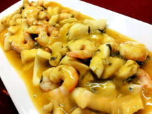 Ingredientes:700 gr. de anillas de Calamar450 gr. de LangostinosAceite de oliva virgen extra300 gr. de agua4 dientes de ajoUn manojo de perejil1 cuch. de harina100 gr. de vino blancoSal