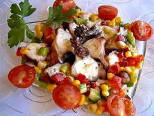 Ingredientes:400 gr. de Pulpo 1/2 Pimiento verde1/2 Pimiento rojo1 Cebolla tierna4 Tomates Cherry 50 g. de Maíz dulce 1 Diente de Ajo1 Pellizco de CominoPimientaAceite de olivaVinagreSal