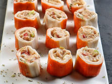 Ingredientes:8 Palitos de cangrejo (Surimi)1 lata pequeña de anchoas1 lata de atún natural1 cuch. de Mayonesa1 cuchta de Ketchup8-10 Aceitunas deshuesadasCebolleta fresca1 trozo de Pimiento morrónDecorar: Huevas de mújol