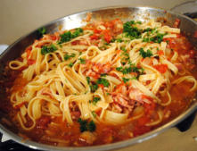 Ingredientes:400 g de bucatini (espagueti huecos)200 g de tocino de la carrillada de cerdo1 vaso de vino blanco secoTomates pequeñosPecorino (queso de oveja) ralladoAjíSal