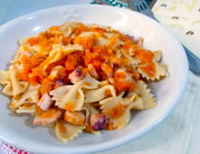 Ingredientes:400 g de pasta Farfalle1 kg de pulpo cocido200 g de salsa de tomate1 zanahoria1 apio1 cebollaagua caliente al gustoAceite de oliva virgen PerejilSal al gustoUna pizca de pimienta