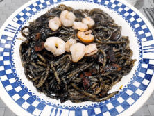 Ingredientes:400 gr. de Espagueti1 bolsita de Tinta de Calamar1,5 cebollas5 dientes de ajo5 cuch. de aceite de olivaSalPimienta al gusto100 gr. de ambas peladas