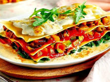 Ingredientes:1 pq. placas de Lasaña 3 Zanahorias1 Calabacín1 Berenjena200 g de Champiñones200 g de Espinacas frescas1 cuch. de Harina200 g de salsa de Tomate500 ml de Leche desnatada100 g de Queso ralladoAceite de olivaSal