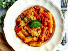 Ingredientes:300 gr. Rigatoni 250 gr. Picadillo de cerdo400 gr. Salsa de Tomates1 Cebolleta1 Ajo200 gr. Queso para gratinarAlbahaca frescaAceite de oliva virgen extraSal