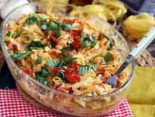 Ingredientes:250 gr de Pasta Linguini500 gr de Tomates Cherry150 gr de Queso Feta1 cuchta de Sal 1 cuchta de Pimienta1 cuchta de Romero seco90 ml de Aceite de oliva3 dientes de AjoAlbahaca fresca