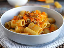 Ingredientes:180 gr de Pasta plumas100 gr de carne de Salchicha230 gr de Calabaza10 gr de Queso Parmesano 25 ml de Vino blancoAceite de oliva (al gusto)Cebolla (al gusto)Ramitas de Romero (al gusto)
