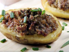 Ingredientes:250 gr. de carne picada4 patatas grandes1 cebolla200 gr. de queso rallado100 ml. de vino blanco1 cucharada de harinaAceiteSalPimienta negraPerejil