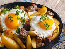 Ingredientes:600 g de Patatas1 Cebolla 300 gr de filetes de Ternera100 gr de Bacon ahumado Sal PimientaMantequillaPerejil fresco Mejorana o Tomillo4 Huevos