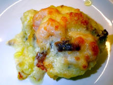 Ingredientes:6 Patatas no muy grandes100 gr. de Jamón serrano 100 gr. de Queso rallado 100 gr. de Gambas peladas200 ml. de Nata50 gr. de Cebolla50 gr. de AceiteSal Pimienta