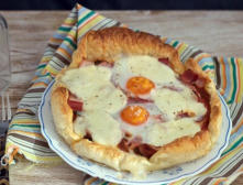 Ingredientes:1 lámina de hojaldre1 cebolla2 calabacines pequeños 2 berenjenasAceite de oliva virgen extraSalPimienta molidaSalsa de tomate frito6 lonchas de bacon2 o 4 huevos1 bola de mozzarella fresca
