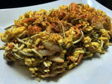 Ingredientes:30 gr. Aceite de oliva virgen 100 gr. de GulasAjo en polvo 100 gr. de Salmón ahumado100 gr. de Gambas peladas 4 Huevos tamaño medianoSalPimientaPimentón dulce