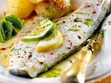 Ingredientes:2 Lubinas limpias 2 Limas1 Limón12 Patatas pequeñas8 Cebolletas francesas150 ml de Vino blancoUnas ramitas de Eneldo100 ml de Aceite de olivaSalPimientaUnos granos de Pimienta rosa
