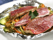 Ingredientes:6-8 Salmonetes200 gr. de Judías verdes2 Cebolletas2 Zanahorias2 Puerros1 pimiento verde1 Calabacín pequeño1 diente de Ajo4 cuch. de Vino blancoAceite de olivaSalPerejil