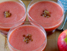 Ingredientes:700 gr Tomate pera 1 Pimiento verde italiano 1 Pepino pequeñoAceite de oliva virgen extra Vinagre de manzana al gustoSal 2 Manzana tipo Fuji o Pink 60 gr. Pan duro Agua al gusto