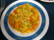 Ingredientes:9 huevos medianos5 patatas medianas 80 g de jamón serrano picado60 g pimiento rojo 60 g pimiento verde (175 g guisantes1 cebolla mediana150 g de setas (opcional)Aceite de oliva virgen extraSal (al gusto)