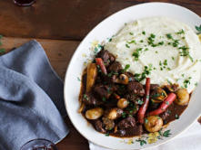 Ingredientes:500 gr de carne de buey2 cebollas3 zanahorias1 ramillete de hierbas (tomillo, laurel...)750 ml vino tinto100 gr de bacon1 diente ajo100 gr de champiñonessalpimienta