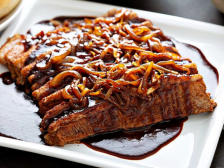 Ingredientes:2 Kg. Brisket (pecho de ternera) 3 Cebolla1,5 vaso de Vino tinto1 vaso de Caldo de carne1 chorrito de Salsa de soja1 cuch. de Azúcar blancoMezcla de hierbas aromáticas SalPimienta negraAceite de oliva