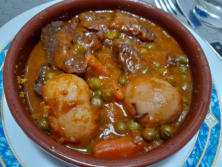 Ingredientes:150 gr. Carne de Ternera25 gr. Guisantes congelados2 Patatas pequeñas1 Zanahorias pequeña½ Cebolla1 vasito de Vino blancoAceite de GirasolTomate concentradoAjoSal1 hoja de LaurelCaldo de verduras