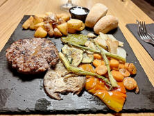 Ingredientes:Hamburguesa de Ternera.Patatas cortadas a trozosRodajas de BerenjenaPimiento rojoPimiento verdeChampiñones3 Espárragos triguerosSalPimientaAceite de Oliva