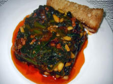 Ingredientes:1 kg. de Espinacas congeladas90 g. de taquitos de Jamón.1 cuch. sopera de Piñones.1 cuch. de Pasas de Corinto.3 dientes de Ajo.3 cuch. de Tomate frito