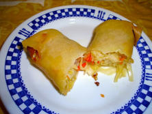 Ingredientes:100 grs brotes de soja 2 cdas salsa de soja 1/2 cebolleta en juliana 1 zanahoria rallada 60 grs setas shitakes 150 grs carne de cerdo laminada 200 grs repollo en juliana 12 laminas pasta filo aceite de oliva