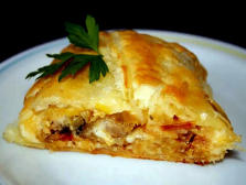 Ingredientes:1 pl. Hojaldre rectangular.8 lonchas de Queso 1 Puerro mediano.1/2 Pimiento rojo grande.1/2 Cebolla mediana.1 diente de Ajo mediano.2 huevos 100 grc de champiñones Aceite de olivaSal1 ramita de PerejilPimienta.