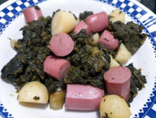 Ingredientes:300 gr. de Espinacas congeladas2 Salchichas de Frankfurt1 bote de Patatas cocidas2 o 3 dientes de Ajo1 o 2 hojas de Laurel3 cuch. de aceite de oliva½ cuchta de Pimentón dulceSal Pimienta negra molida