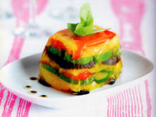 Ingredientes:2 Berenjenas5 Calabacines2 Pimientos rojos2 Pimientos amarillos4 gr. de agar-agar20 cl. de jugo de Tomate casero1 manojo de AlbahacaSalPimienta