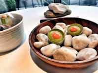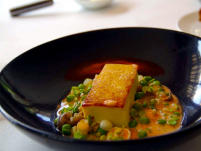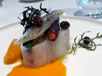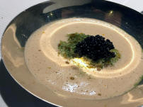 Crema de Gambas escarlatas con aceite de curry, baño de Coral y Caviar.