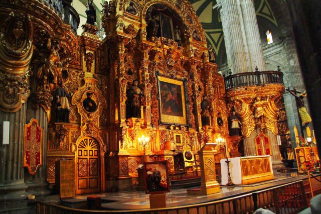Catedral Asunción de María: Plomada que indica la inclinación del edificio construido sobre lo que fue un lago.