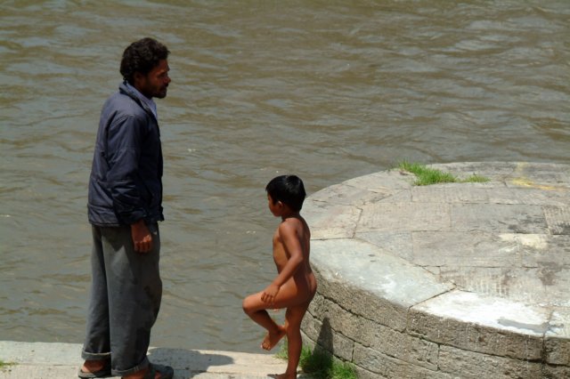 Rito funerariio: Bañistas en la orilla de enfrente de los altares de incineración