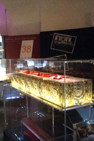 Relicario donde se guardaba la Sábana Santa hasta el el indendio de 1997 y tubo donde se enrollaba.